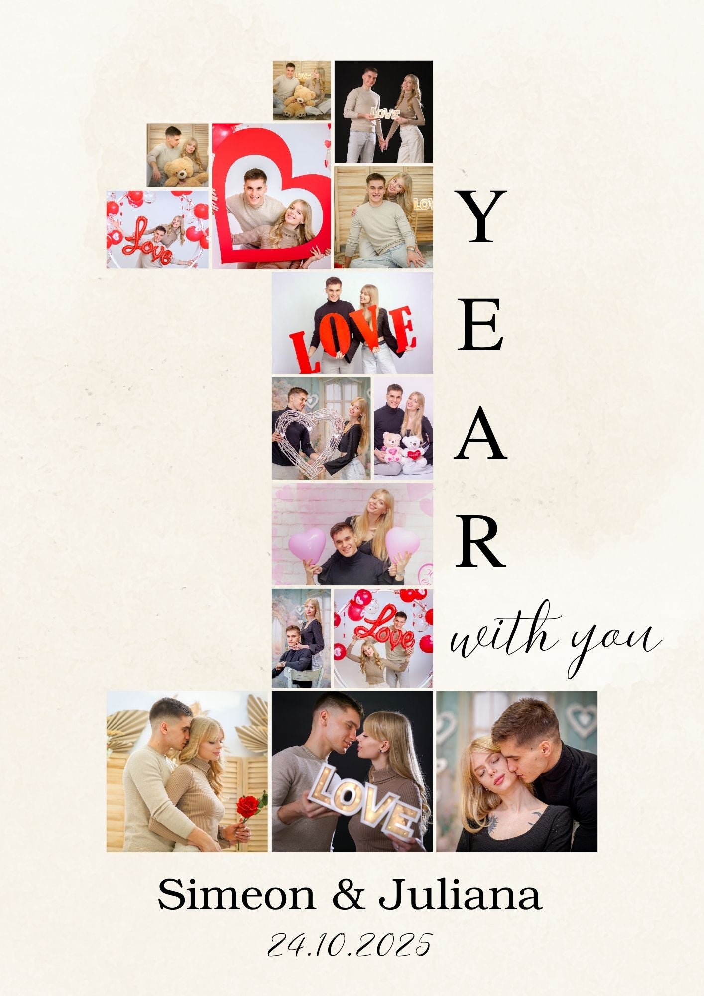 Романтичен колаж, посветен на първата ви година заедно – 365 дни усмивки, спомени и обич. Перфектен подарък за годишнина, който запечатва всеки специален момент от вашата история.